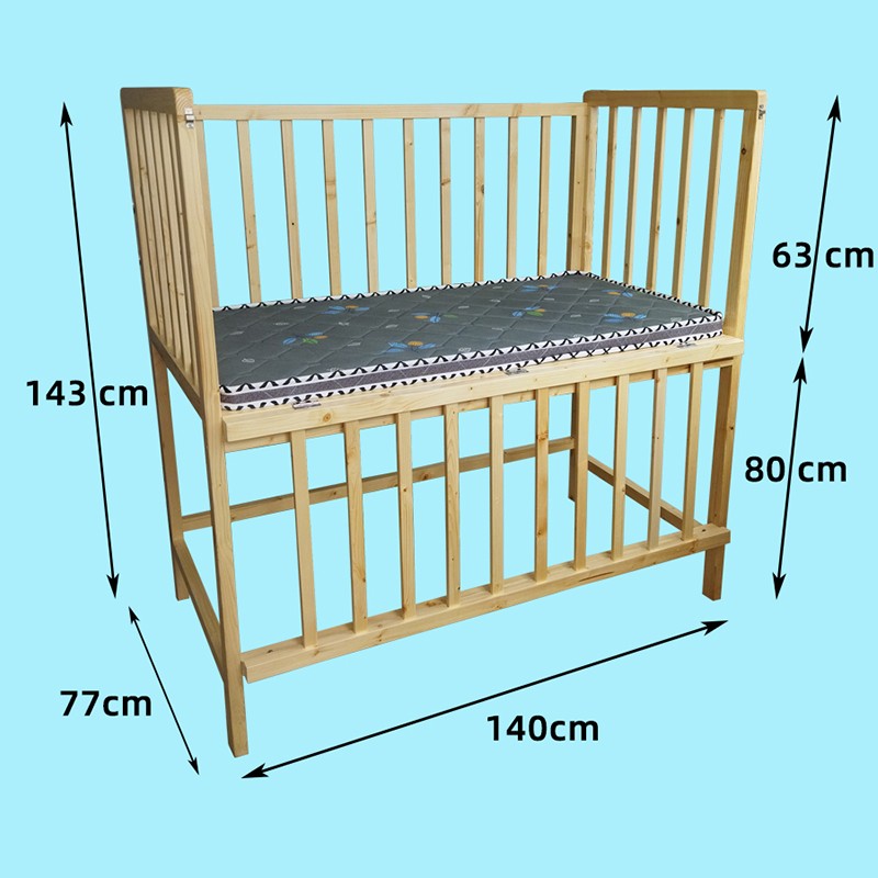 長140cm,寬77cm,高143cm,欄高63cm。一側護欄可開合,配備床墊。