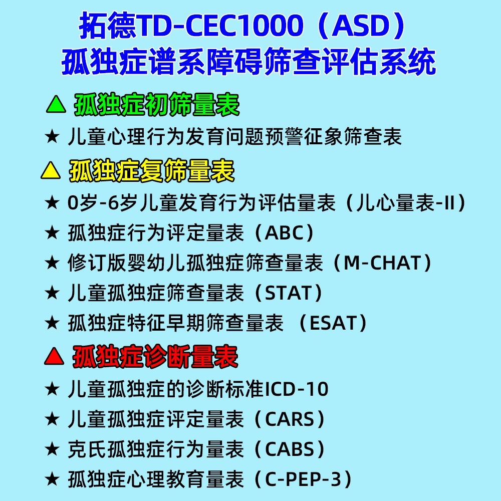3、0-6歲兒童孤獨(dú)癥譜系障礙評(píng)估系統(tǒng)(ASD)以衛(wèi)生健康委頒發(fā)的《0-6歲兒童孤獨(dú)癥篩查干預(yù)服務(wù)規(guī)范》為藍(lán)本編寫而成。