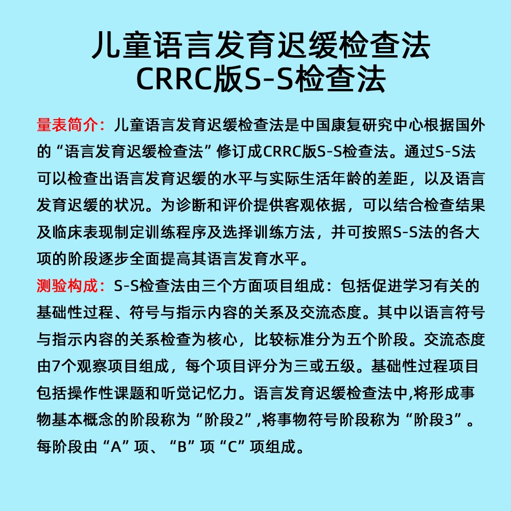 兒童語(yǔ)言發(fā)育遲緩檢查法是1990年中國(guó)康復(fù)研究中心根據(jù)日本語(yǔ)言發(fā)育遲緩委員會(huì)編制的“語(yǔ)言發(fā)育遲緩檢查法”修訂成CRRC版S-S檢查法(sign-significane,S-S法)。通過(guò)S-S法可以檢查出語(yǔ)言發(fā)育遲緩的水平與實(shí)際生活年齡的差距,以及語(yǔ)言發(fā)育遲緩的狀況。為診斷和評(píng)價(jià)提供客觀依據(jù),可以結(jié)合檢查結(jié)果及臨床表現(xiàn)制定訓(xùn)練程序及選擇訓(xùn)練方法,并可按照S-S法的各大項(xiàng)的階段逐步全面提高其語(yǔ)言發(fā)育水平。